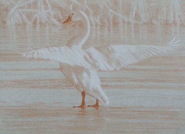 Left posterior study of a tundra swan with outstretched wings Natural red chalk and natural white chalk